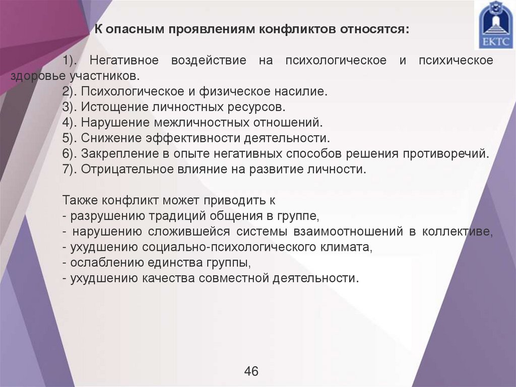 К опасным проявлениям конфликтов относятся:1). Негативное воздействие на психологическое и психическое