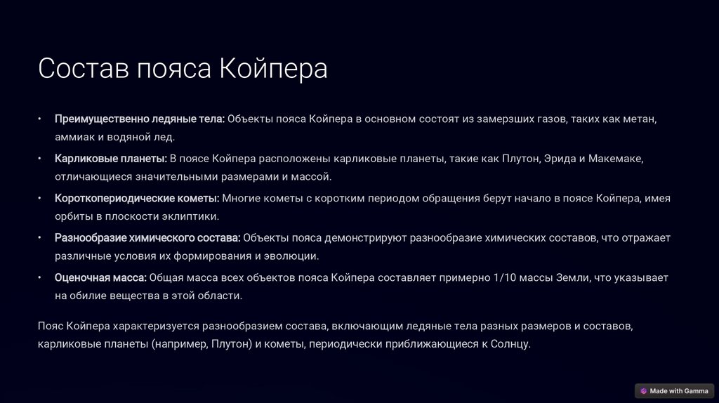 Состав пояса КойпераПреимущественно ледяные тела: Объекты пояса Койпера в основном состоят из замерзших газов, таких как метан,