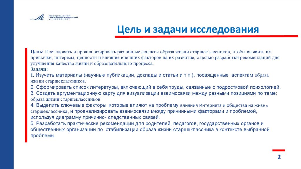 Цель и задачи исследованияЦель: Исследовать и проанализировать различные аспекты образа жизни старшеклассников, чтобы выявить их