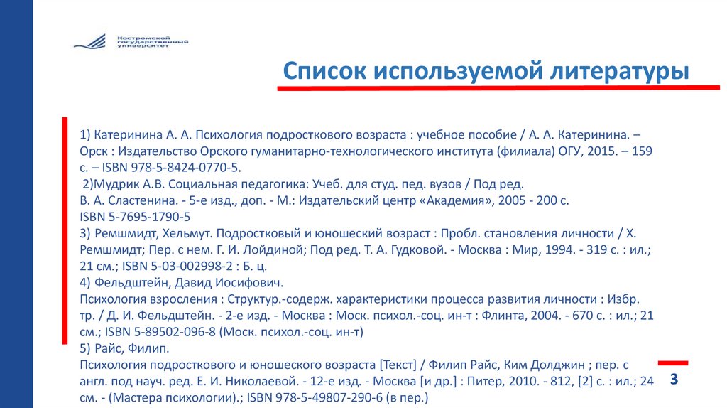 Список используемой литературы1) Катеринина А. А. Психология подросткового возраста : учебное пособие / А. А. Катеринина. –
