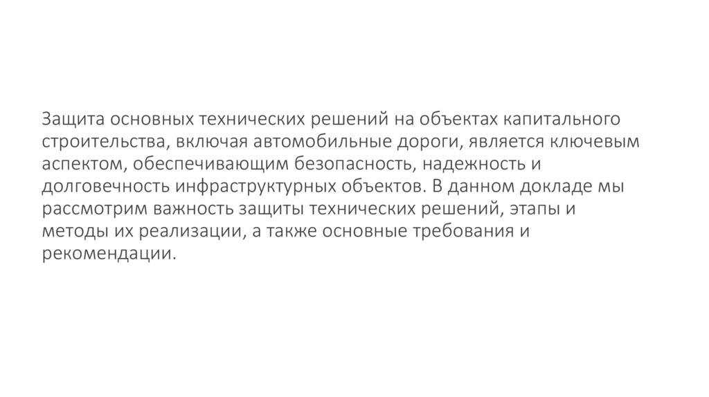 Защита основных технических решений на объектах капитальногостроительства, включая автомобильные дороги, является ключевым