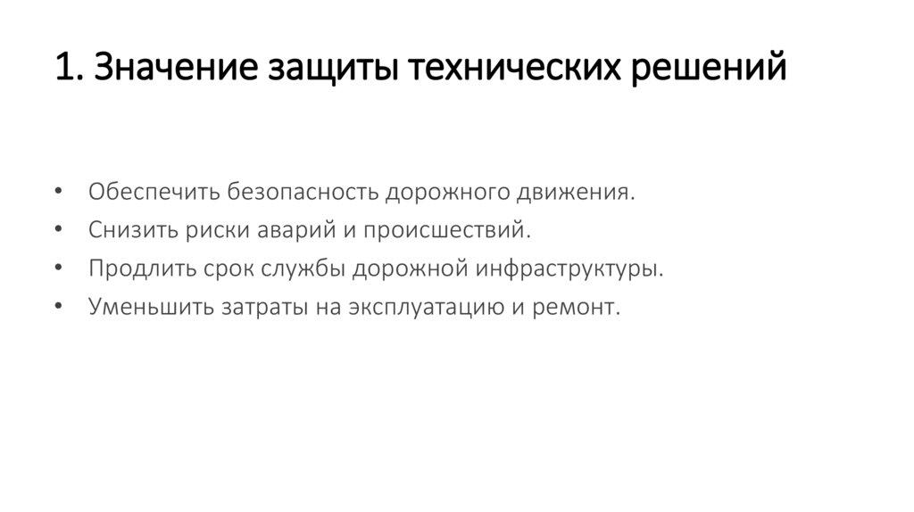 1. Значение защиты технических решенийОбеспечить безопасность дорожного движения.