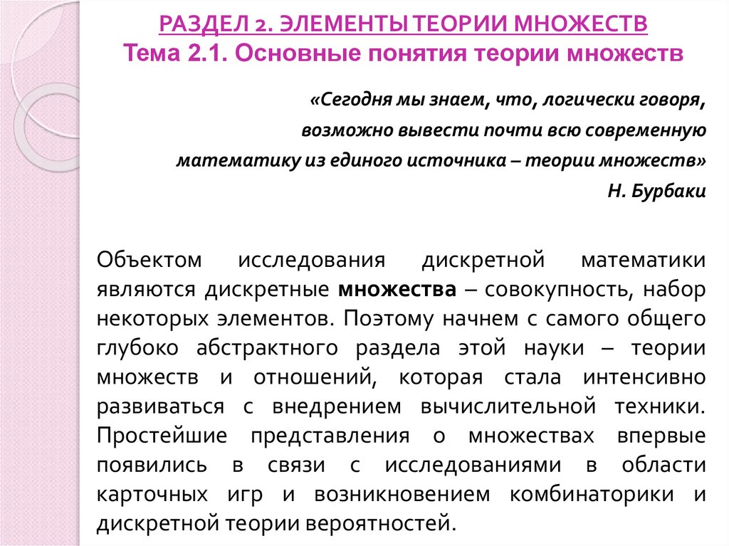1. РАЗДЕЛ 2. ЭЛЕМЕНТЫ ТЕОРИИ МНОЖЕСТВ Тема 2.1. Основные понятия теории множеств