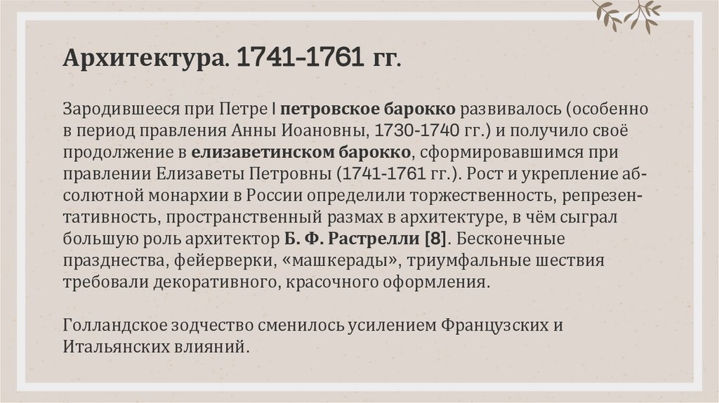 правлении Елизаветы Петровны (1741-1761 гг.). Рост и укрепление абсолютной монархии в России определили торжественность, репрезентативность, пространственный размах в архитектуре, в чём сыграл