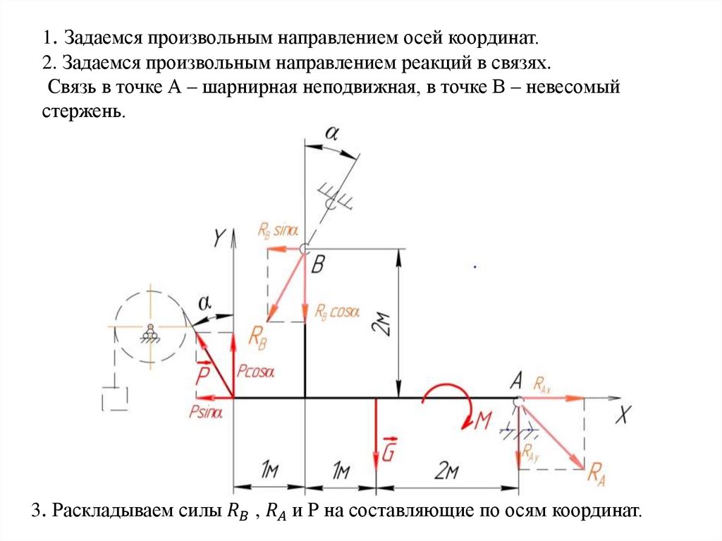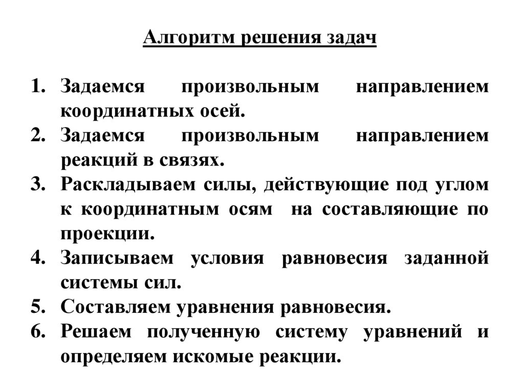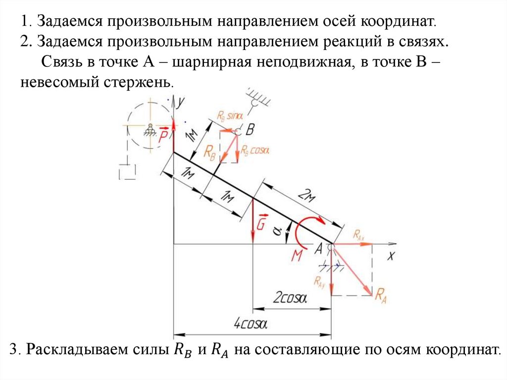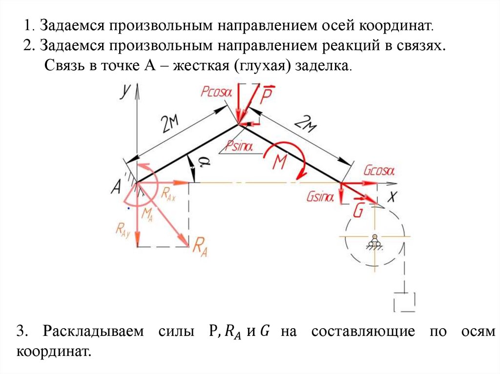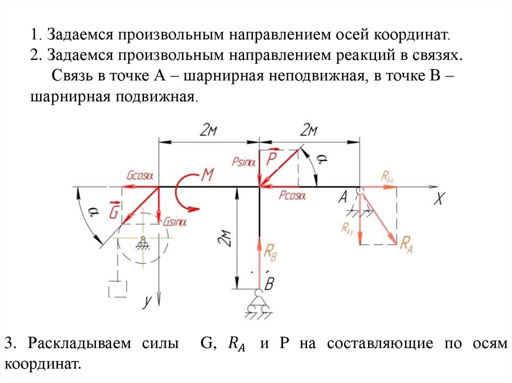 1. Задаемся произвольным направлением осей координат.2. Задаемся произвольным направлением реакций в связях.
