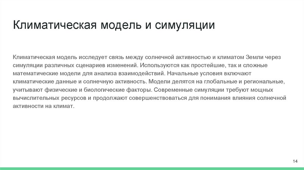 Климатическая модель и симуляцииКлиматическая модель исследует связь между солнечной активностью и климатом Земли через