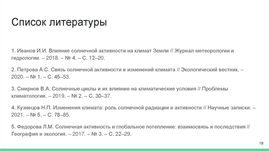 Список литературы1. Иванов И.И. Влияние солнечной активности на климат Земли // Журнал метеорологии и