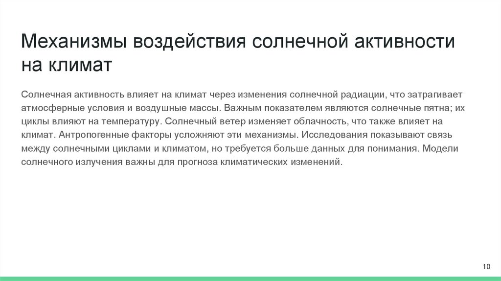 Солнечная активность влияет на климат через изменения солнечной радиации, что затрагивает