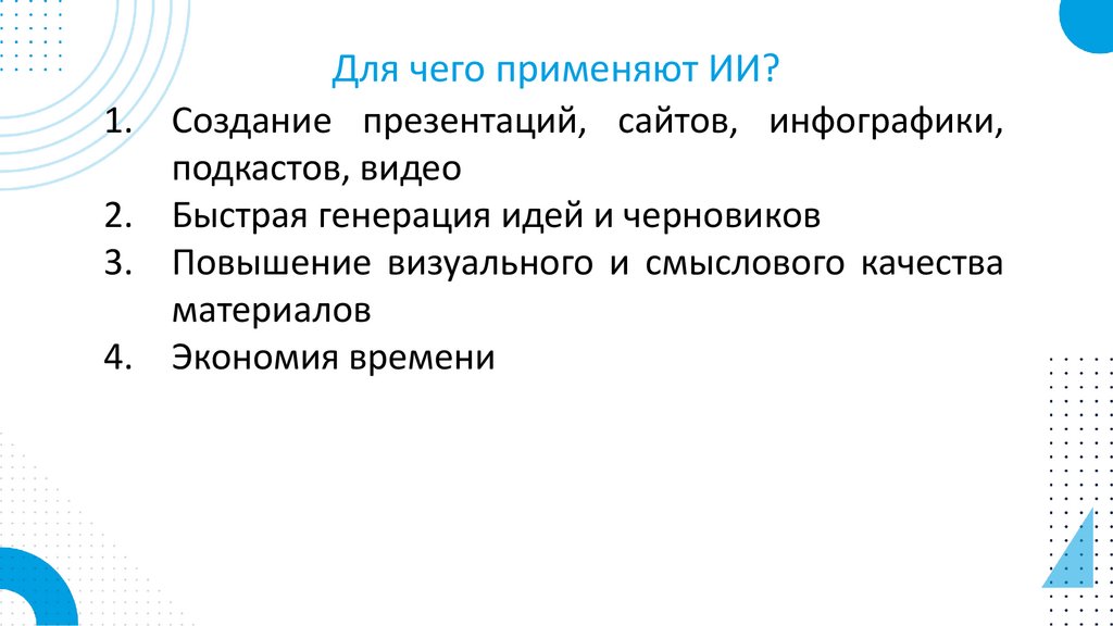 Для чего применяют ИИ?1. Создание презентаций, сайтов, инфографики,