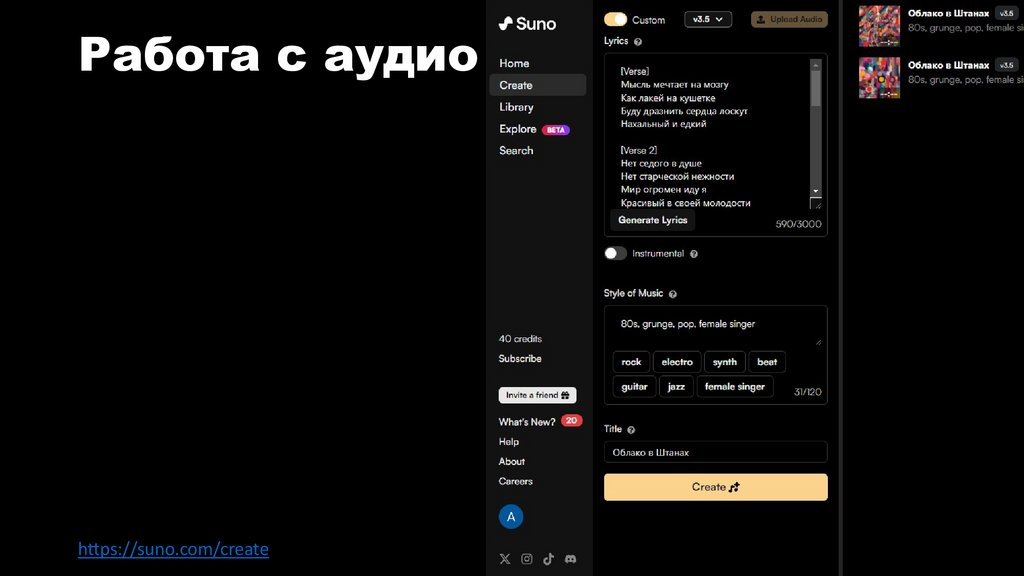 Работа с аудиоhttps://suno.com/create