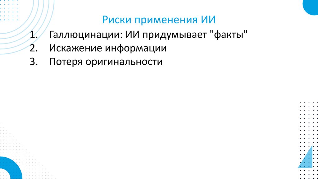 Риски применения ИИ1. Галлюцинации: ИИ придумывает "факты"
