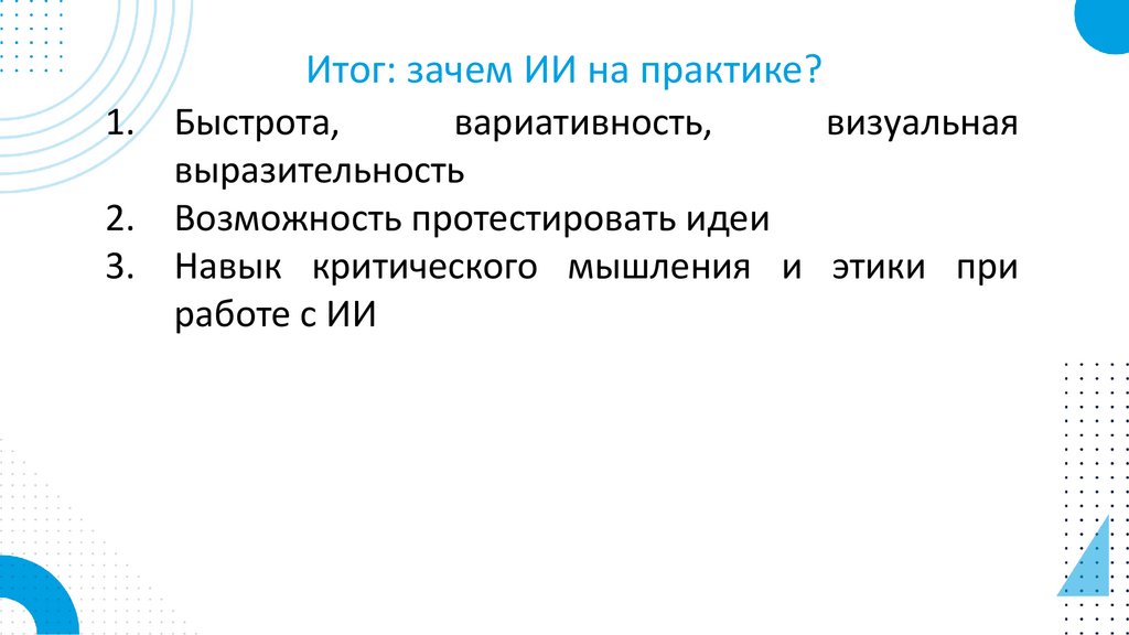 Итог: зачем ИИ на практике?1. Быстрота,
