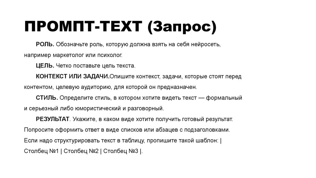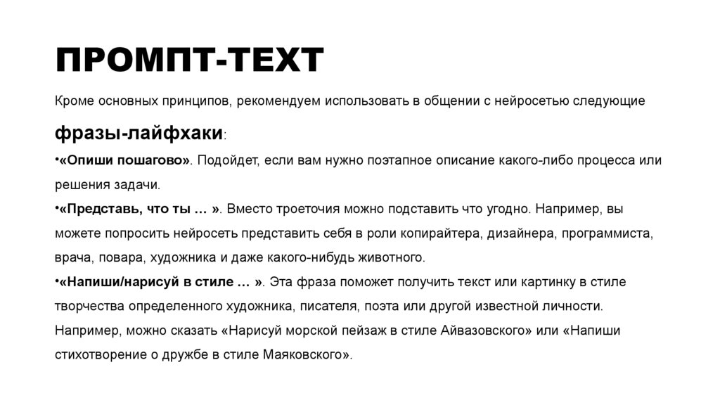 ПРОМПТ-TEXTКроме основных принципов, рекомендуем использовать в общении с нейросетью следующие