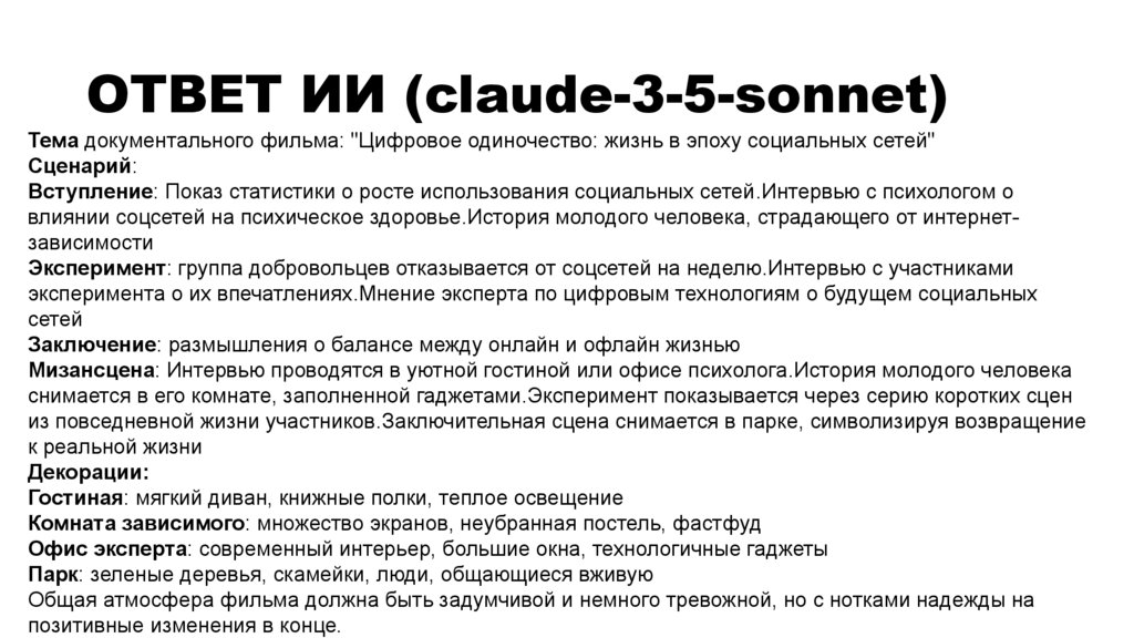 ОТВЕТ ИИ (claude-3-5-sonnet)Тема документального фильма: "Цифровое одиночество: жизнь в эпоху социальных сетей"