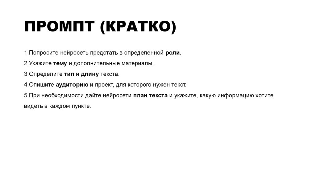 ПРОМПТ (КРАТКО)1.Попросите нейросеть предстать в определенной роли.