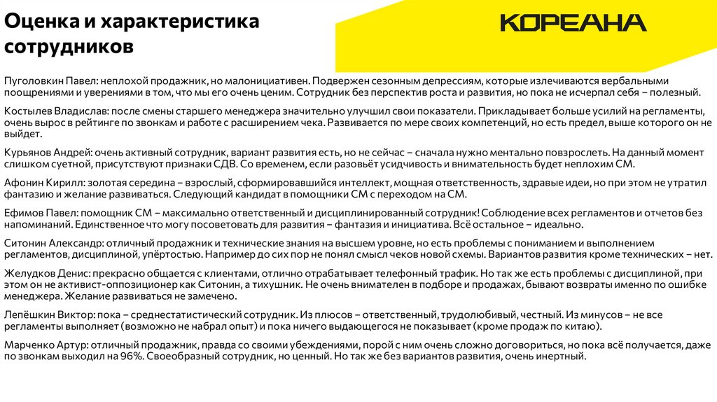 Пуголовкин Павел: неплохой продажник, но малонициативен. Подвержен сезонным депрессиям, которые излечиваются вербальными