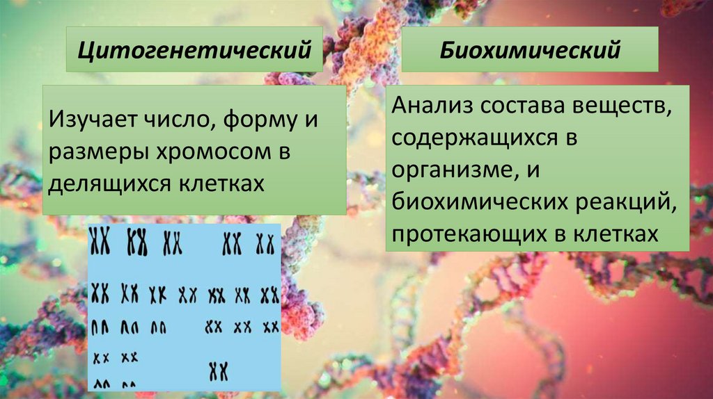 ЦитогенетическийИзучает число, форму и