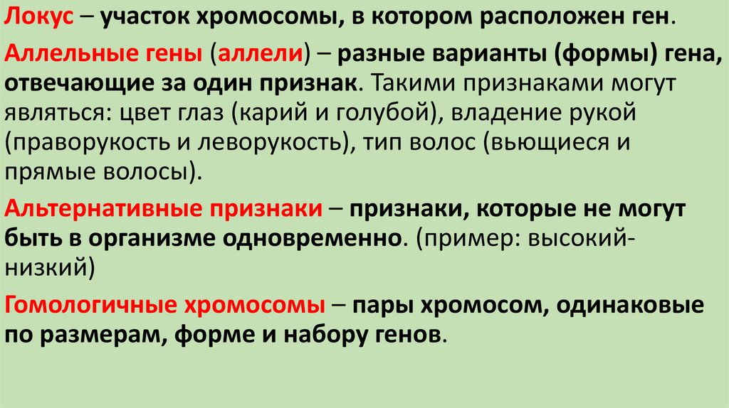 Локус – участок хромосомы, в котором расположен ген.Аллельные гены (аллели) – разные варианты (формы) гена,