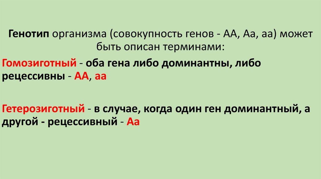 Генотип организма (совокупность генов - AA, Aa, aa) можетбыть описан терминами: