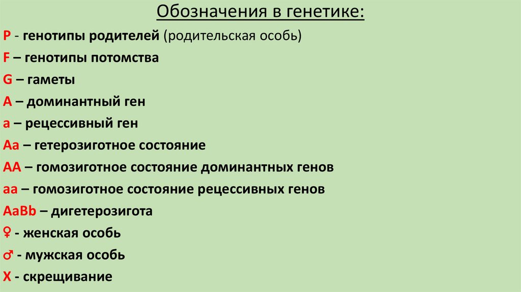 Обозначения в генетике:Р - генотипы родителей (родительская особь)