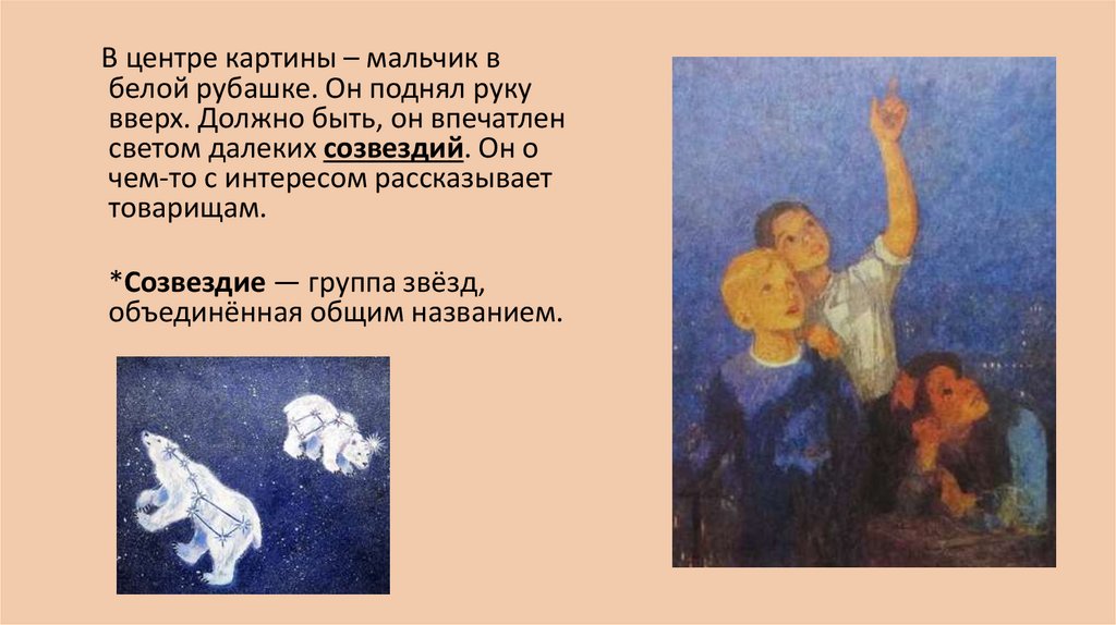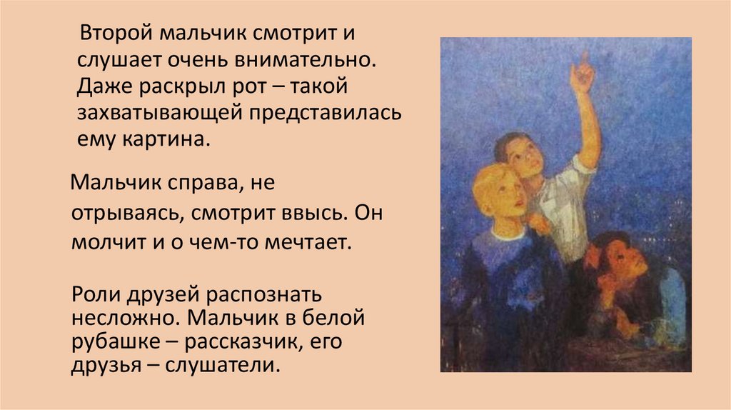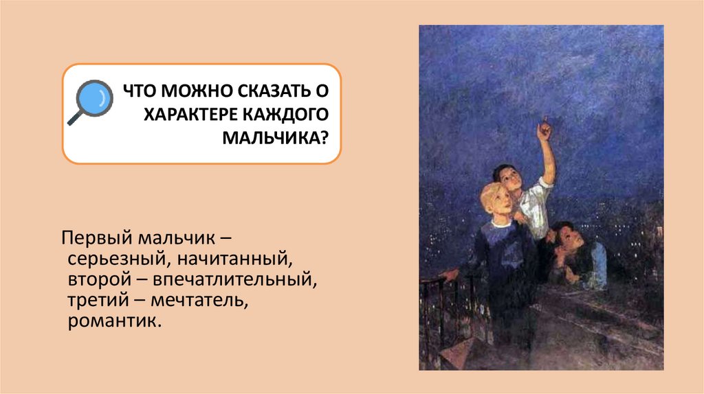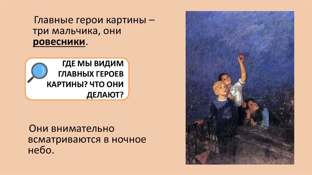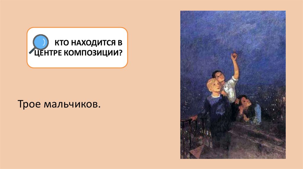 • Художник изображает трёх мальчиков,которые поздним вечером забрались на