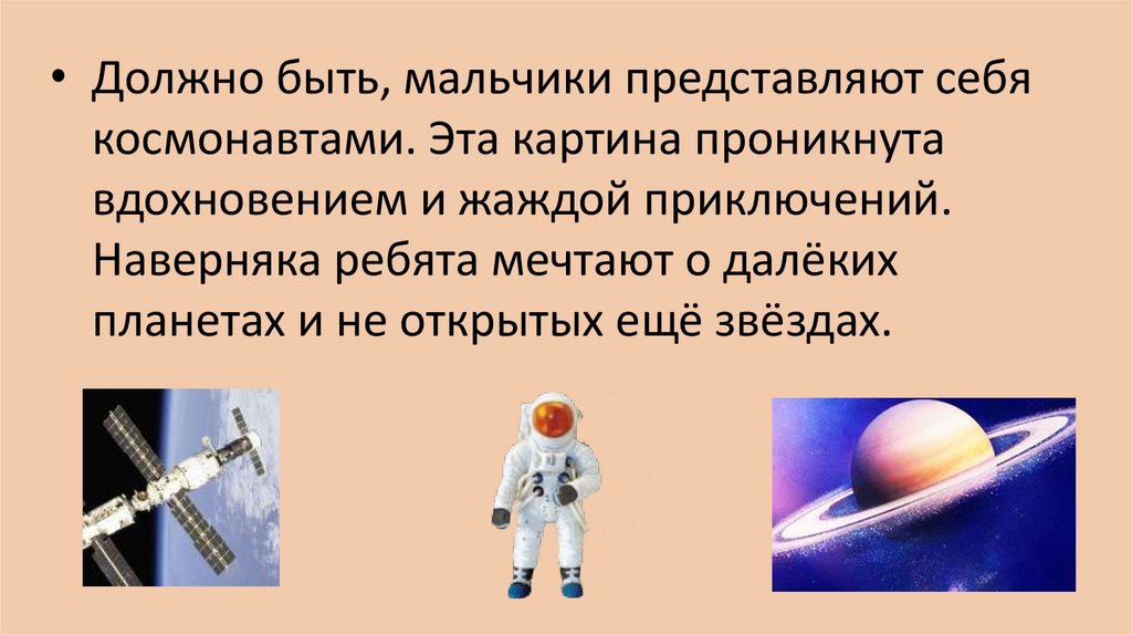 • Должно быть, мальчики представляют себякосмонавтами. Эта картина проникнута