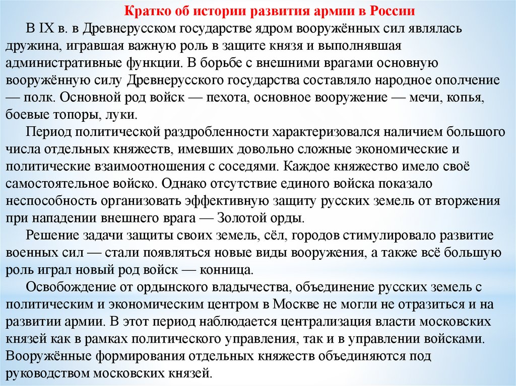 Кратко об истории развития армии в РоссииВ IX в. в Древнерусском государстве ядром вооружённых сил являлась