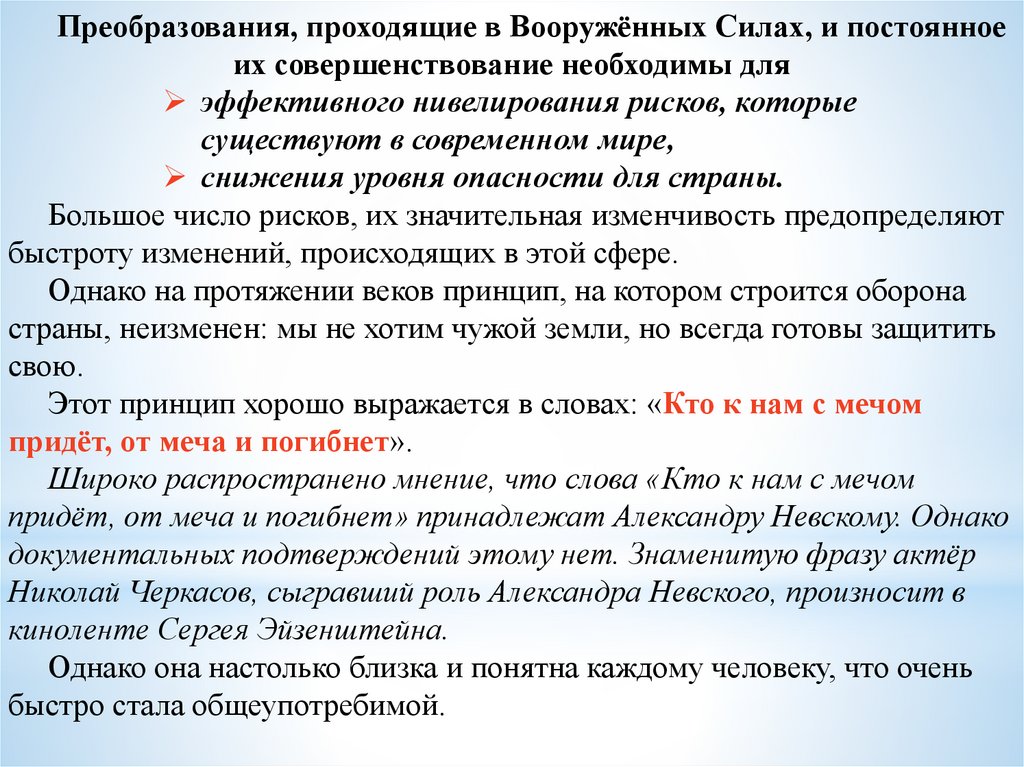 Широко распространено мнение, что слова «Кто к нам с мечом