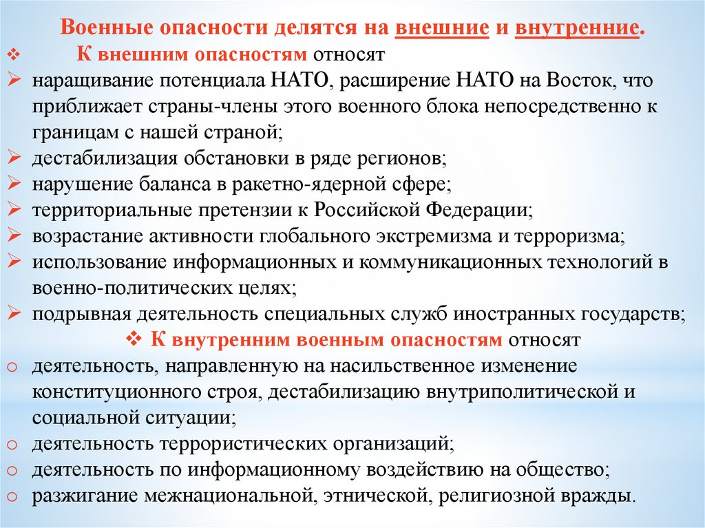 Военные опасности делятся на внешние и внутренние.К внешним опасностям относят