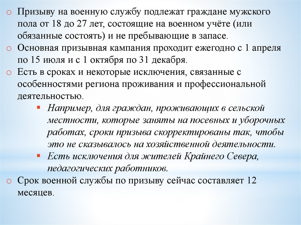 o Призыву на военную службу подлежат граждане мужскогопола от 18 до 27 лет, состоящие на военном учёте (или