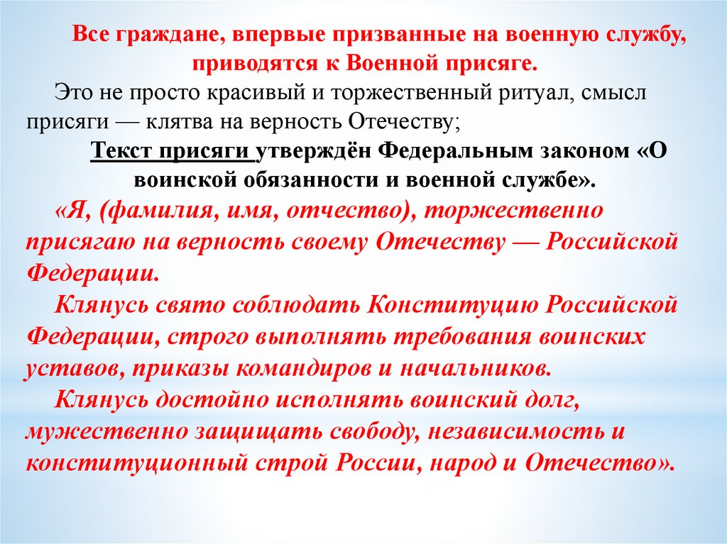 Все граждане, впервые призванные на военную службу,приводятся к Военной присяге.