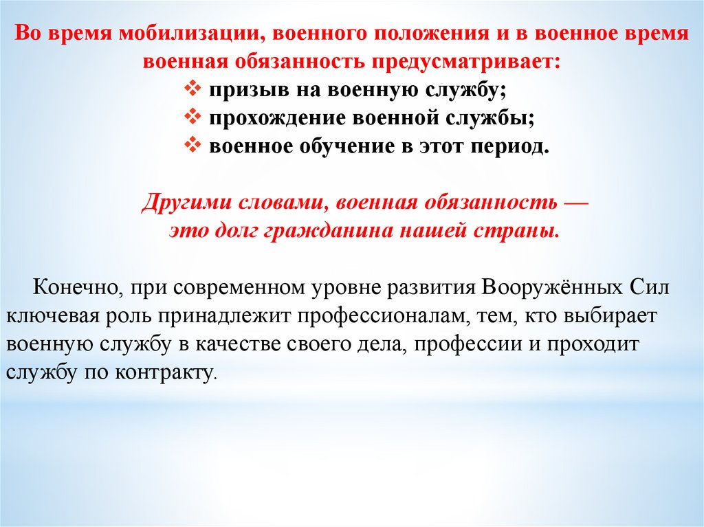 Во время мобилизации, военного положения и в военное времявоенная обязанность предусматривает: