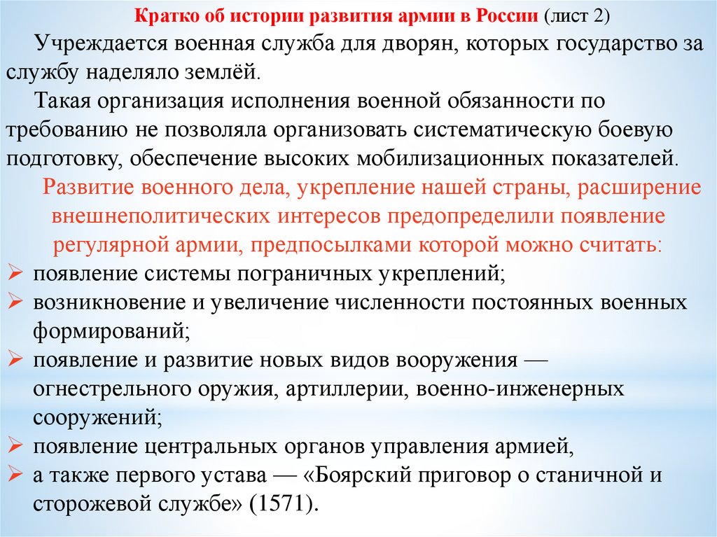 Кратко об истории развития армии в России (лист 2)Учреждается военная служба для дворян, которых государство за