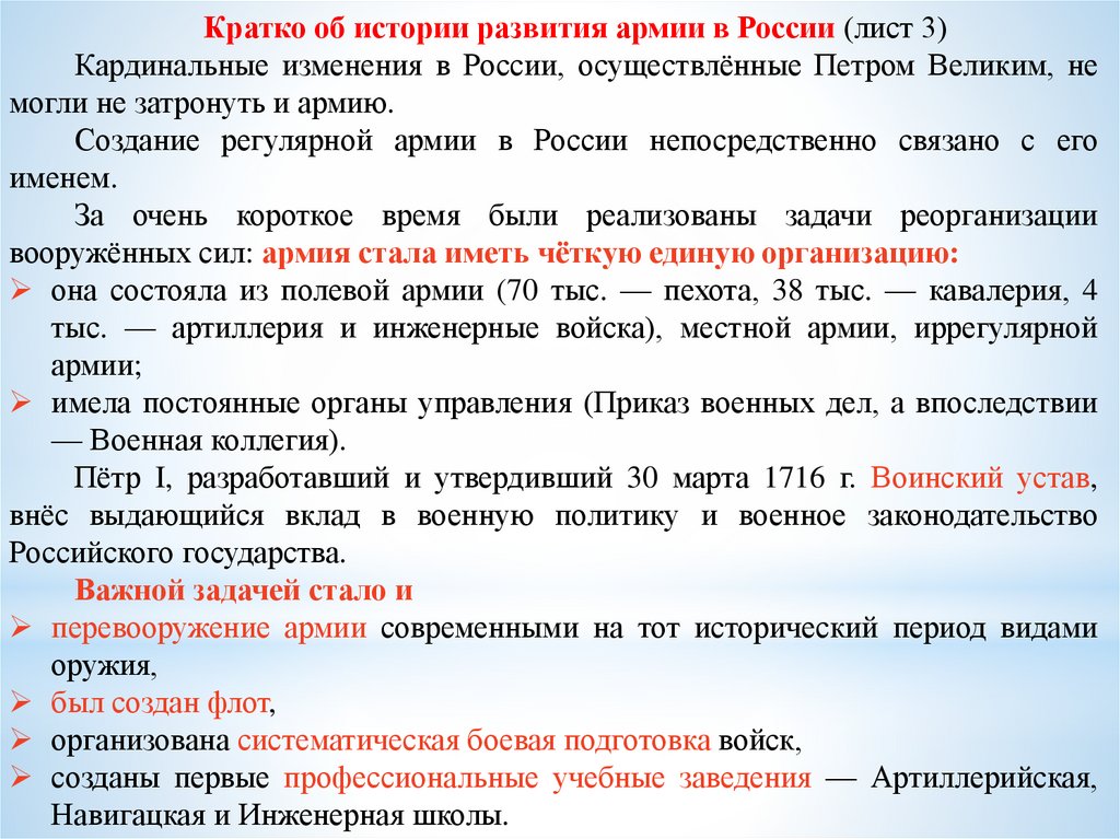 Кратко об истории развития армии в России (лист 3)Кардинальные изменения в России, осуществлённые Петром Великим, не