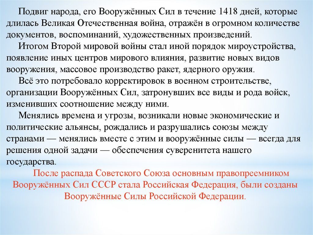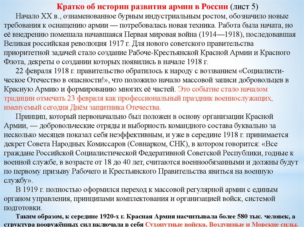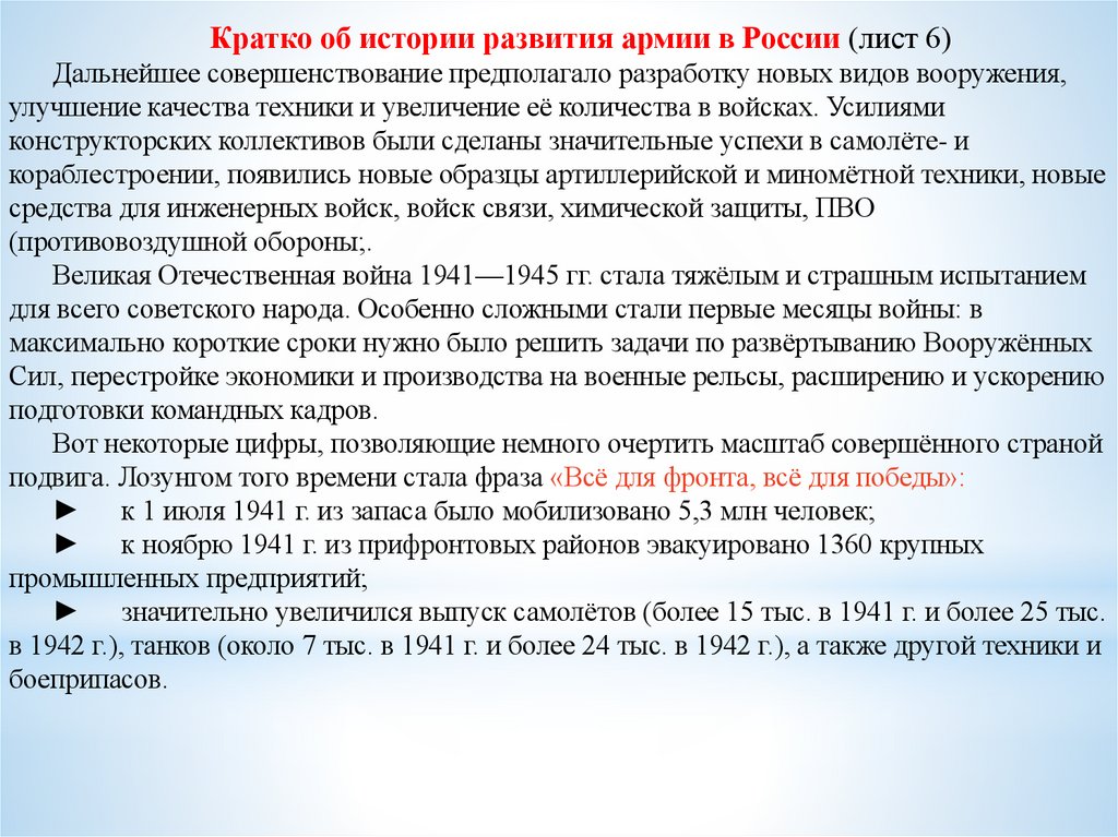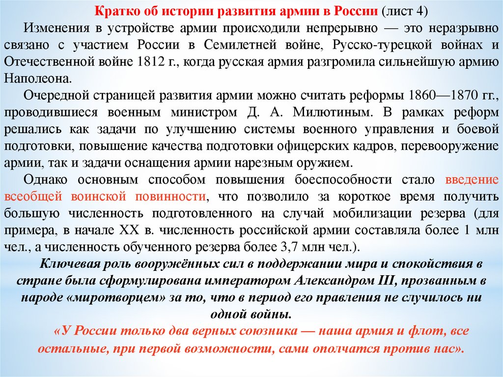 Кратко об истории развития армии в России (лист 4)Изменения в устройстве армии происходили непрерывно — это неразрывно