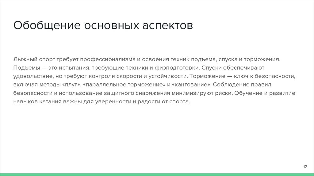 Обобщение основных аспектовЛыжный спорт требует профессионализма и освоения техник подъема, спуска и торможения.