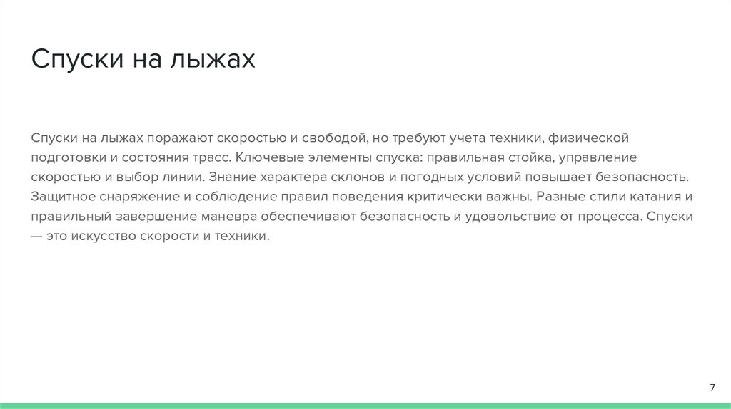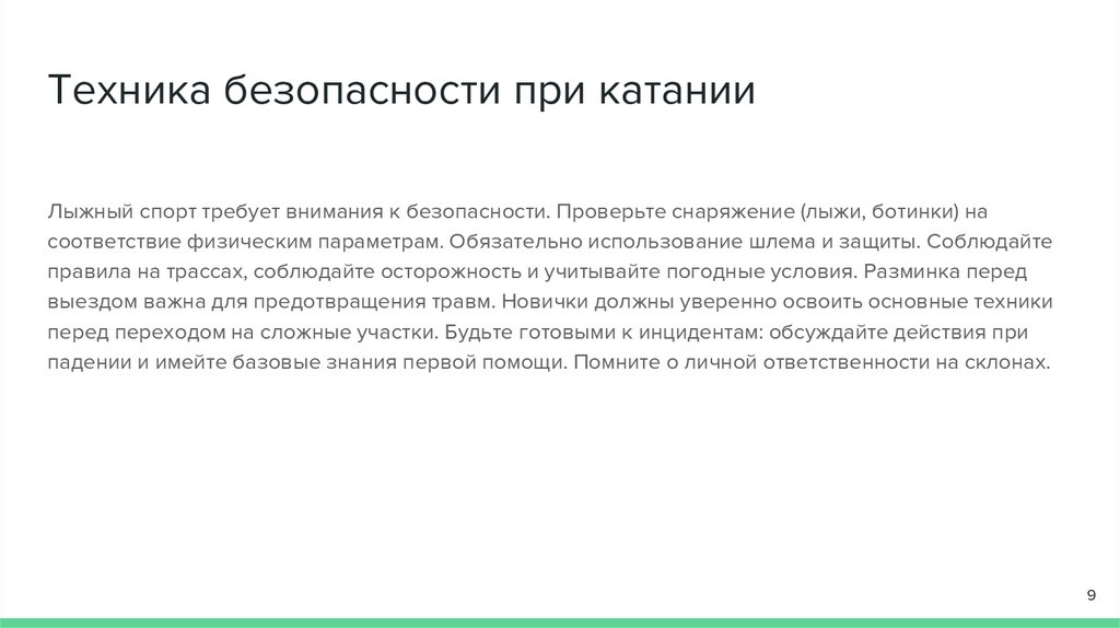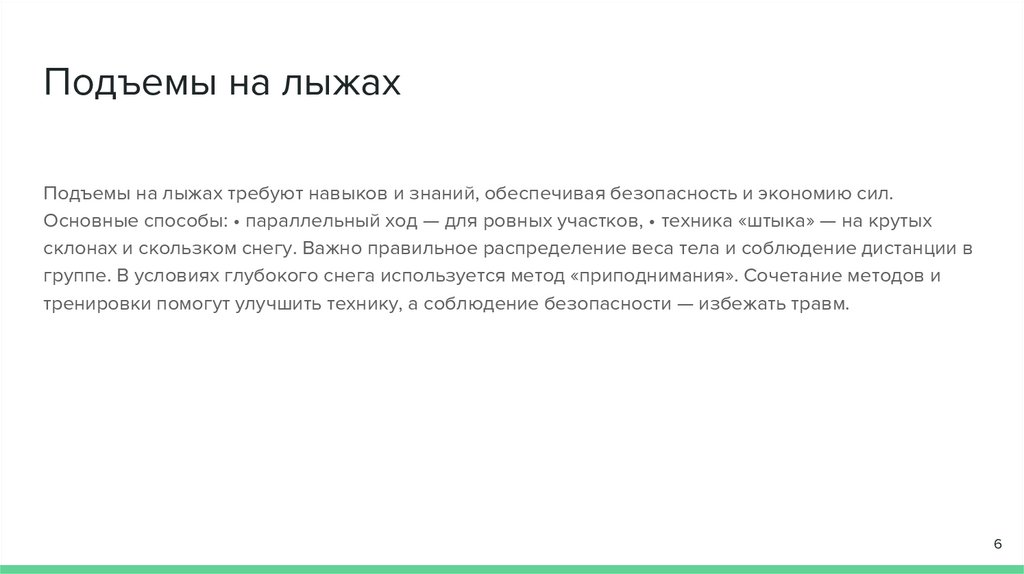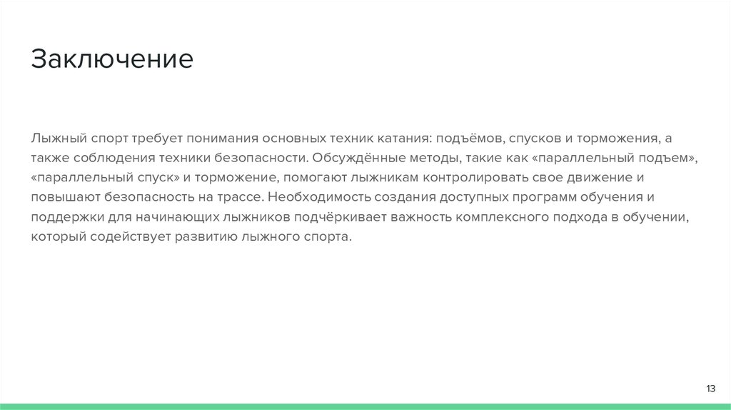 ЗаключениеЛыжный спорт требует понимания основных техник катания: подъёмов, спусков и торможения, а