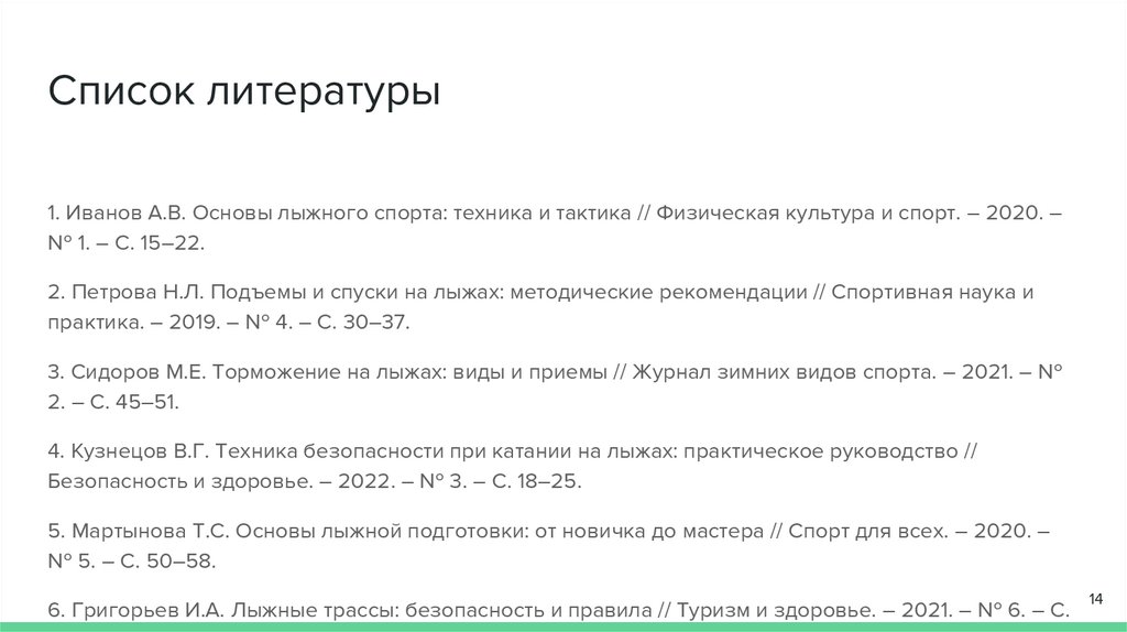 Список литературы1. Иванов A.В. Основы лыжного спорта: техника и тактика // Физическая культура и спорт. – 2020. –