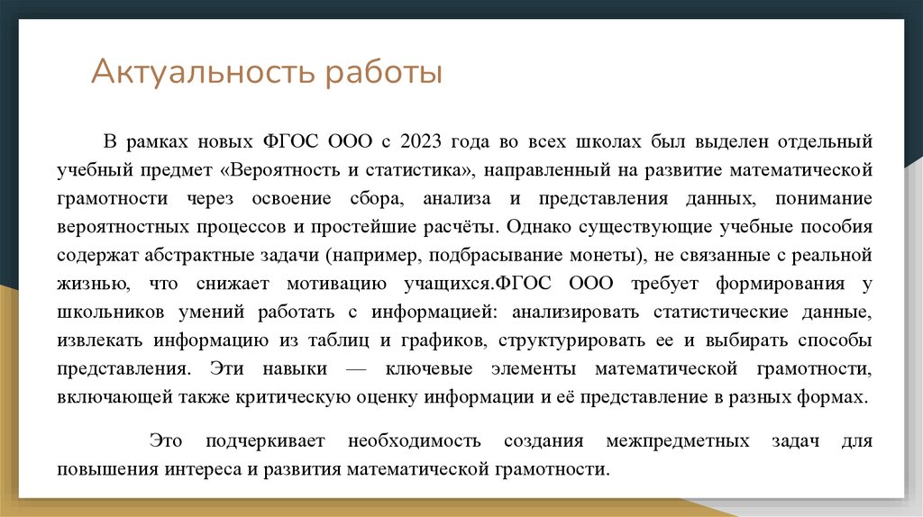 Актуальность работыВ рамках новых ФГОС ООО с 2023 года во всех школах был выделен отдельный