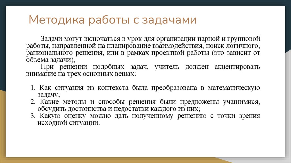 Методика работы с задачамиЗадачи могут включаться в урок для организации парной и групповой