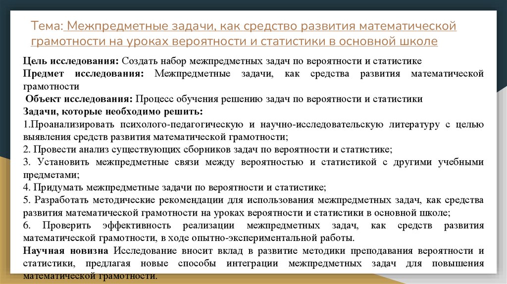 Тема: Межпредметные задачи, как средство развития математическойграмотности на уроках вероятности и статистики в основной школе