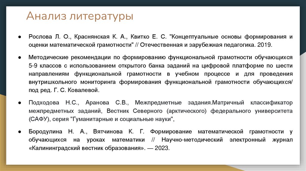 Анализ литературыРослова Л. О., Краснянская К. А., Квитко Е. С. "Концептуальные основы формирования и