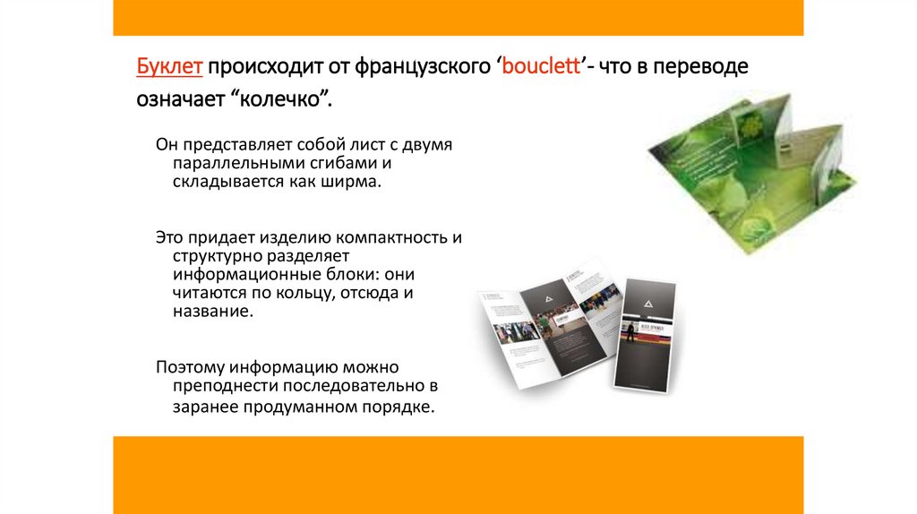 3. Буклет происходит от французского ‘bouclett’- что в переводе означает “колечко”.