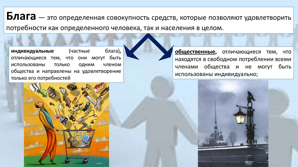 Блага — это определенная совокупность средств, которые позволяют удовлетворитьпотребности как определенного человека, так и населения в целом.