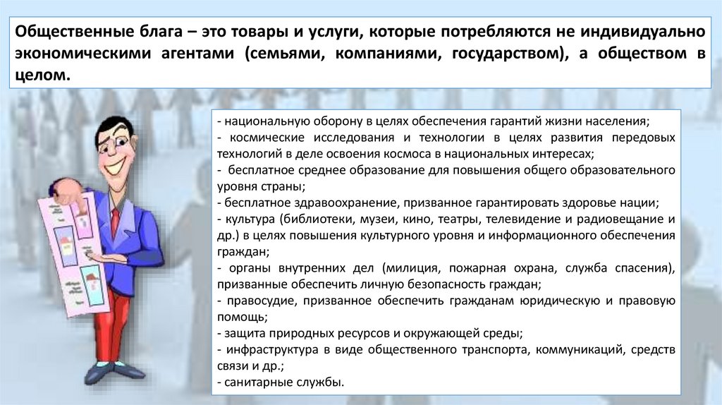 Общественные блага – это товары и услуги, которые потребляются не индивидуальноэкономическими агентами (семьями, компаниями, государством), а обществом в