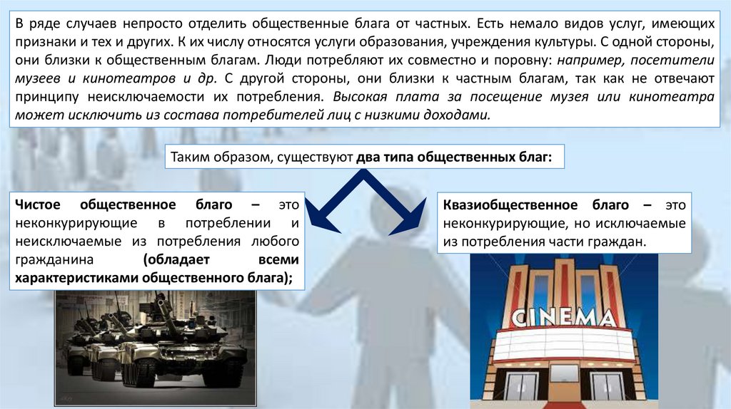 В ряде случаев непросто отделить общественные блага от частных. Есть немало видов услуг, имеющихпризнаки и тех и других. К их числу относятся услуги образования, учреждения культуры. С одной стороны,