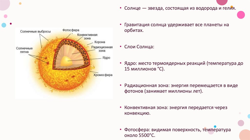 • Солнце — звезда, состоящая из водорода и гелия.• Гравитация солнца удерживает все планеты на