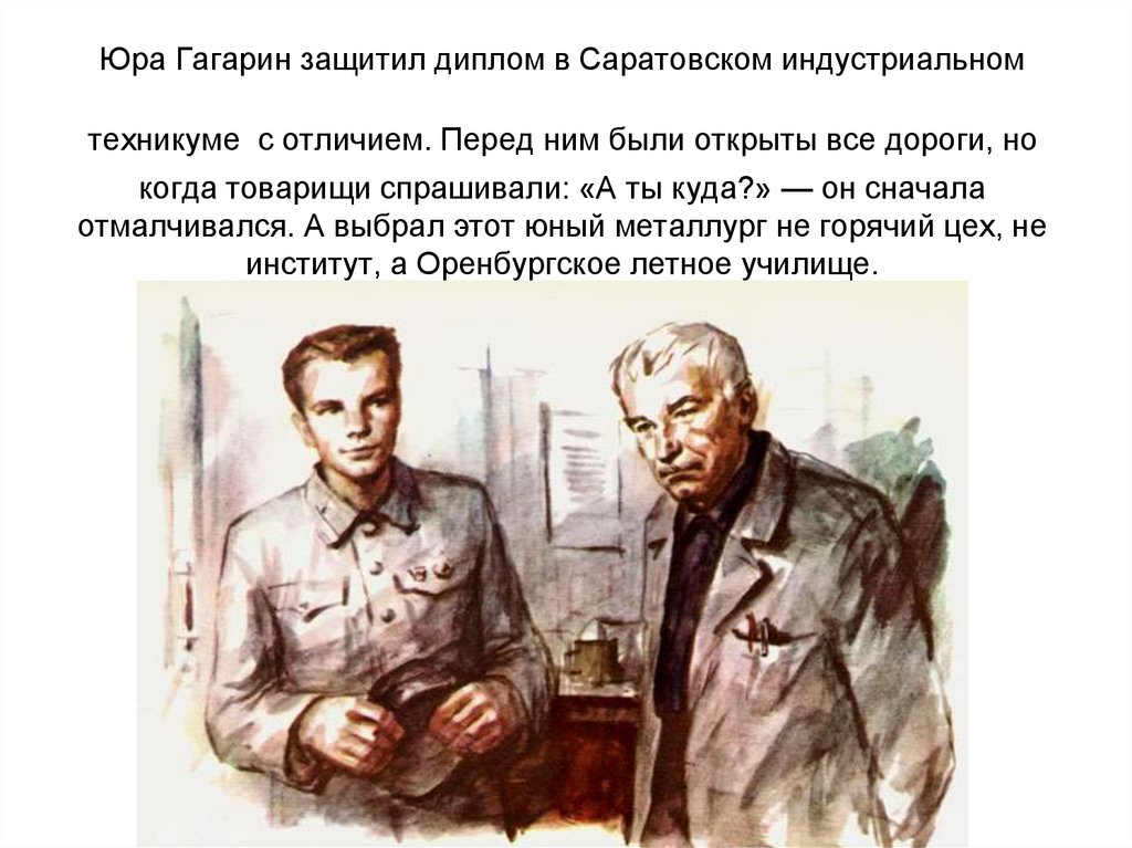 12. Юра Гагарин защитил диплом в Саратовском индустриальном техникуме с отличием. Перед ним были открыты все дороги, но когда