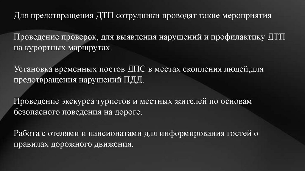 Для предотвращения ДТП сотрудники проводят такие мероприятияПроведение проверок, для выявления нарушений и профилактику ДТП