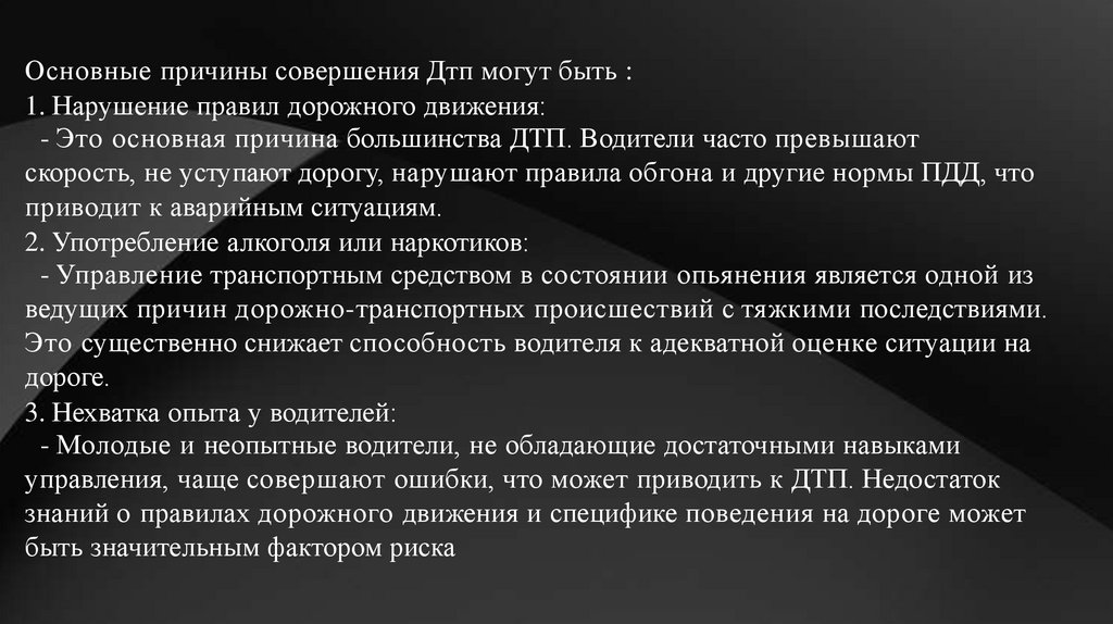 Основные причины совершения Дтп могут быть :1. Нарушение правил дорожного движения: